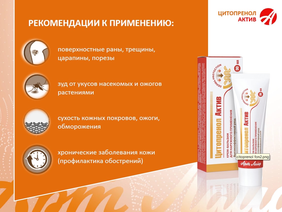 Описание товара: Крем-бальзам «Цитопренол Актив» обладает ранозаживляющим действием, рекомендован для восстановления поврежденной, подверженной постоянному внешнему раздражению кожи. Активные компоненты крема улучшают процессы регенерации, помогают купировать воспалительный процесс, устраняют сухость, раздражение, шелушение, создают защитный барьер, увеличивают период ремиссии при различных кожных заболеваниях (вне стадии обострения).